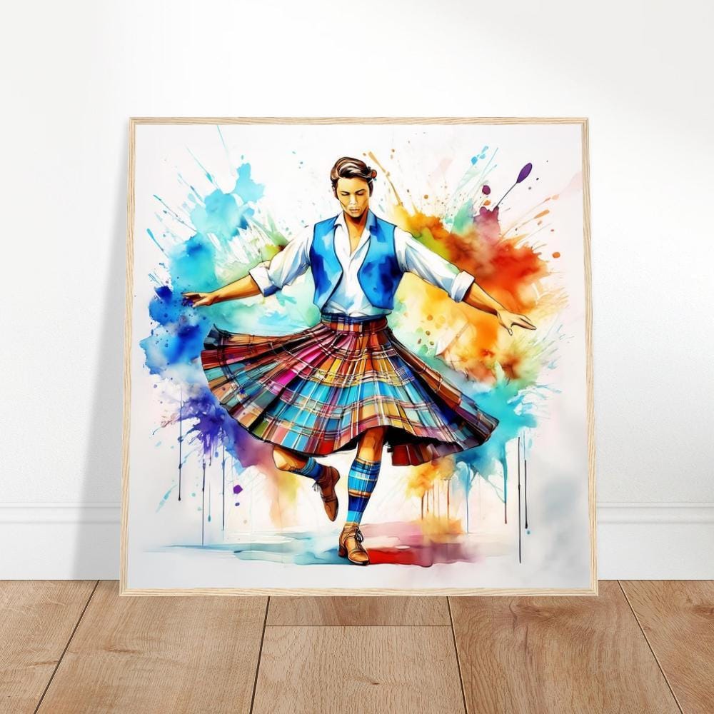 Our framed poster features a male Scottish country dancer rendered in delicate watercolor art, printed on heavyweight white matte paper for a smooth, non-reflective finish.