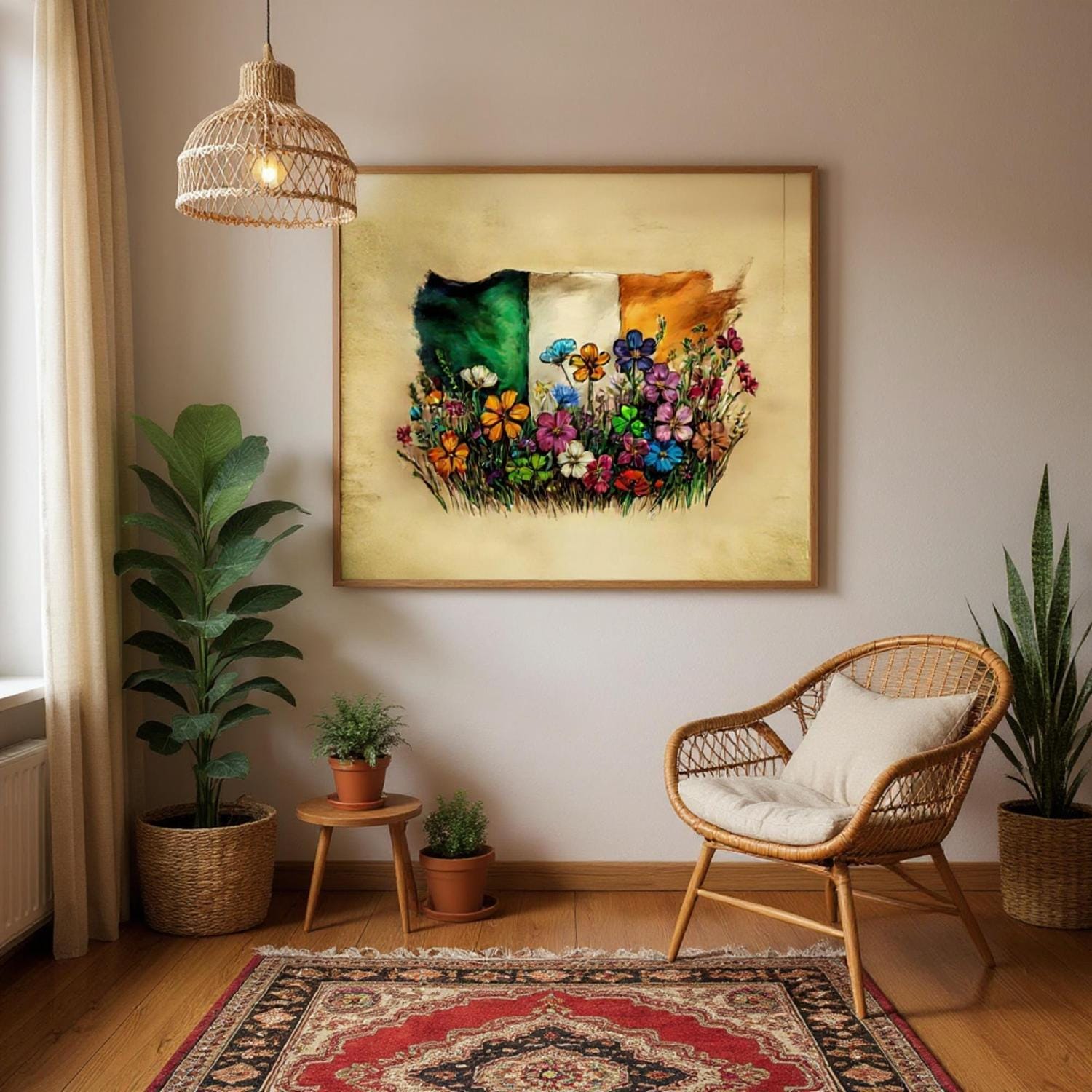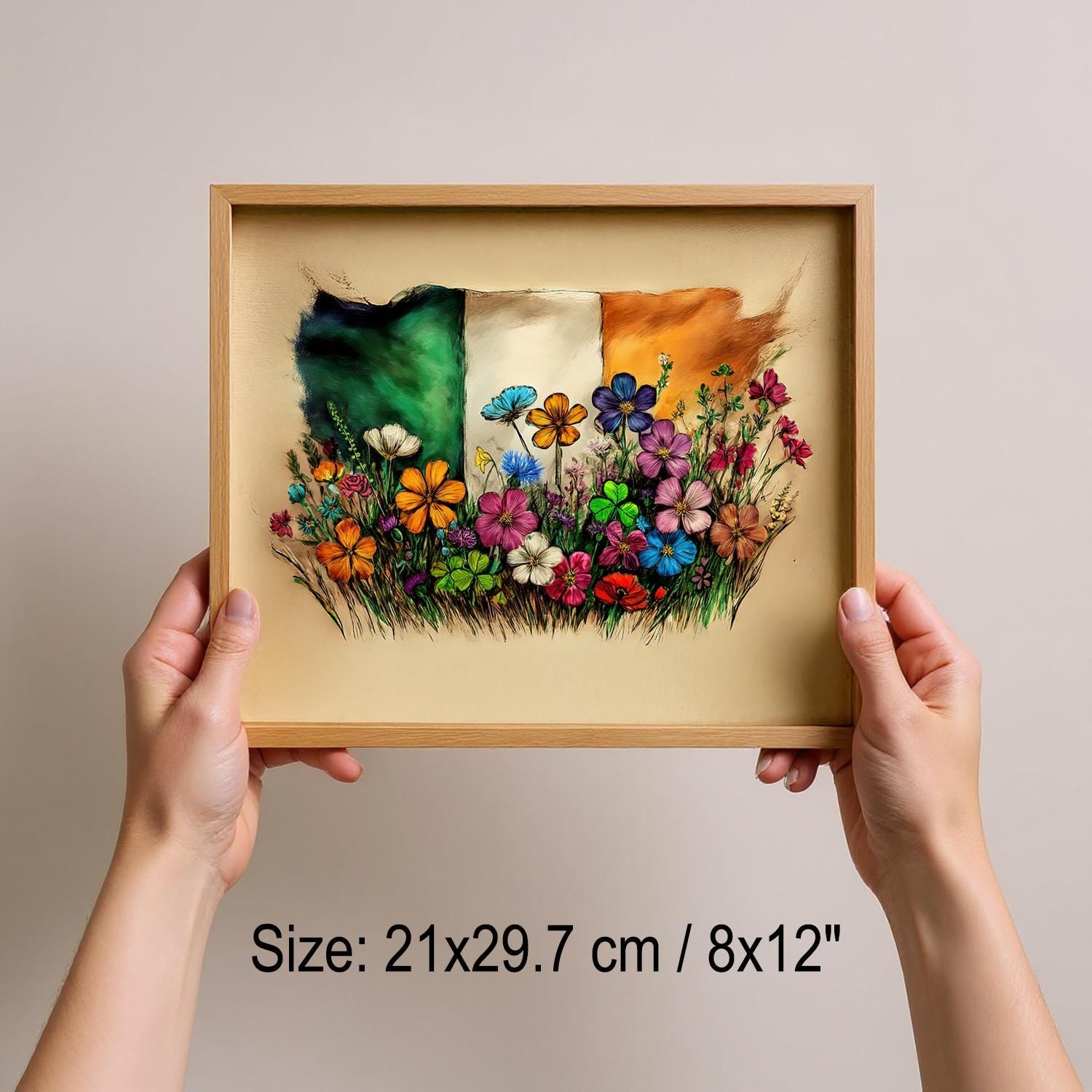 Designed for easy display, this Irish flag print comes ready to hang with a complete hanging kit included. The frame measures between 20-25mm thick and 10-14mm wide, providing a sturdy yet elegant border that complements the handdrawn art style.