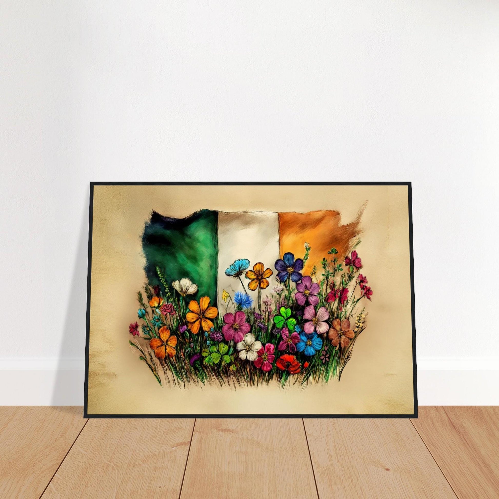 Our framed art print is crafted with care, using durable pine wood available in black, white, natural, or dark brown finishes. Each piece is printed on heavyweight 170 gsm matte paper with a smooth, non-reflective surface that highlights the vivid colors of the Irish flag. The shatterproof plexiglass protects your flag poster while maintaining clarity and durability.