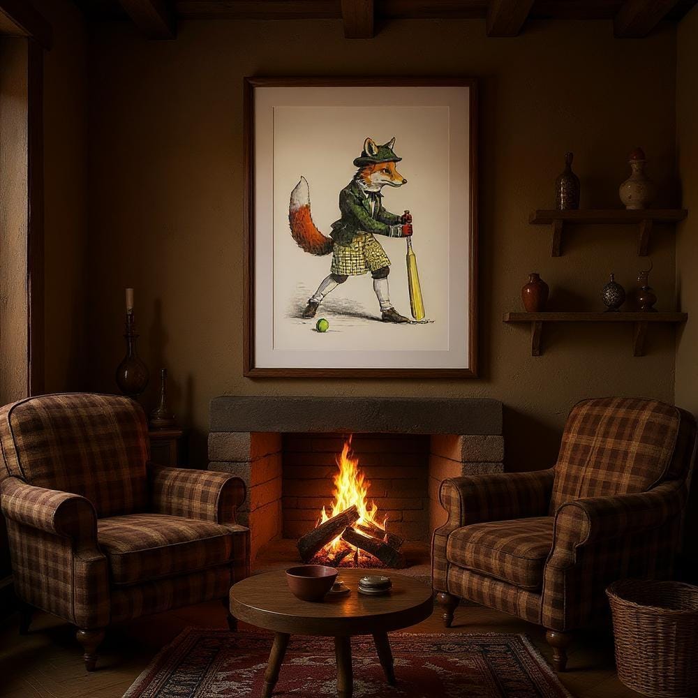 Elevate your decor with this exquisite Victorian fox print that merges cricket charm with timeless British home decor.