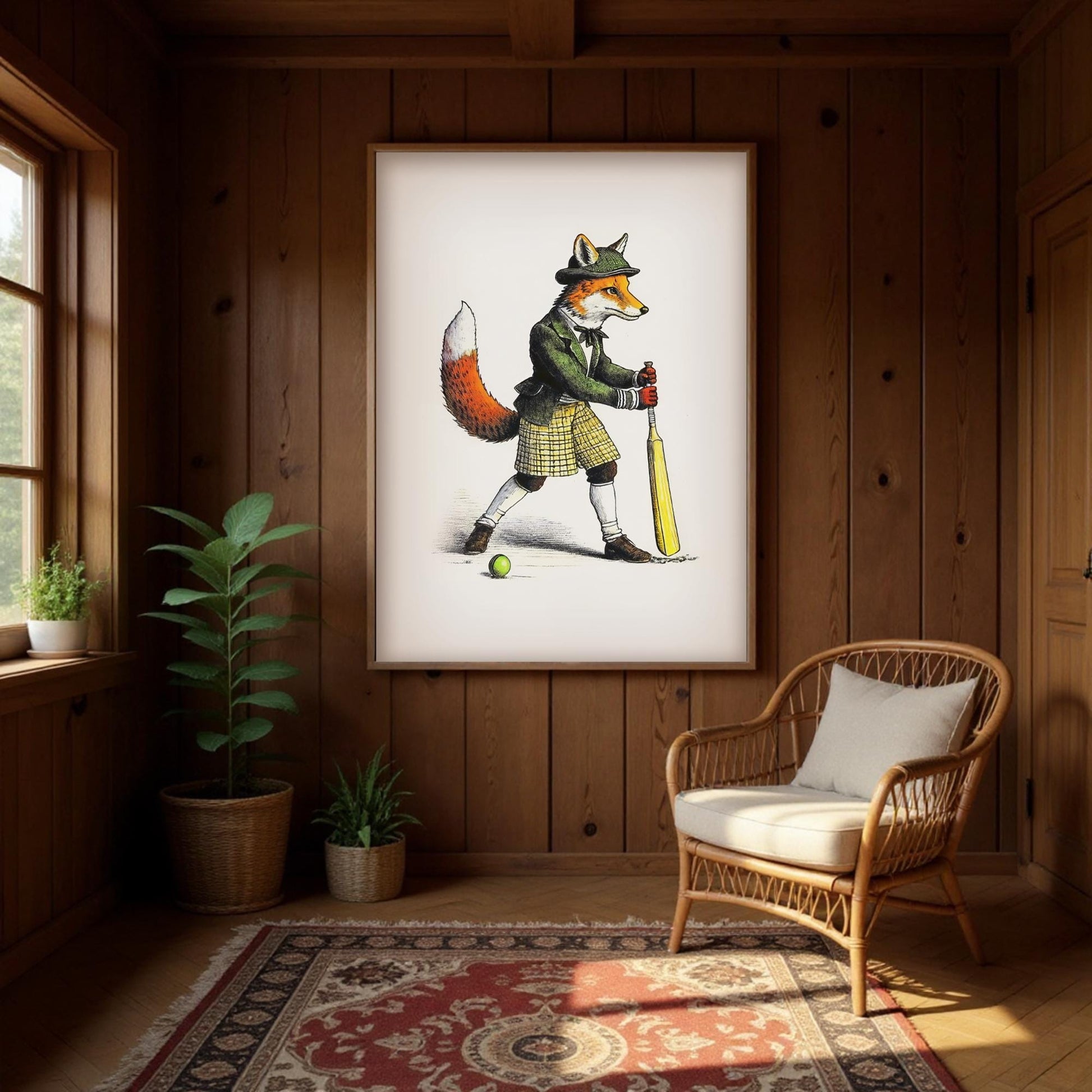 This red fox poster beautifully captures UK heritage with a unique cricket illustration. This British animal art piece adds a touch of Victorian elegance to your home.