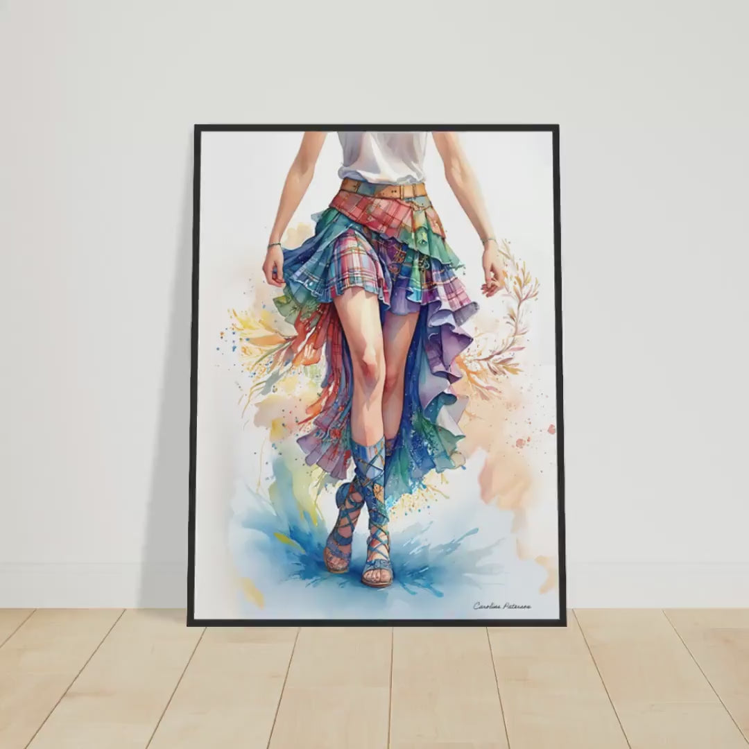 Celebrate Scottish art and heritage with this vibrant watercolor art print featuring a Scottish woman in a tartan skirt and country dancer pose. Printed on premium, heavier-weight white matte paper, this piece brings authentic Scottish charm to your home decor.