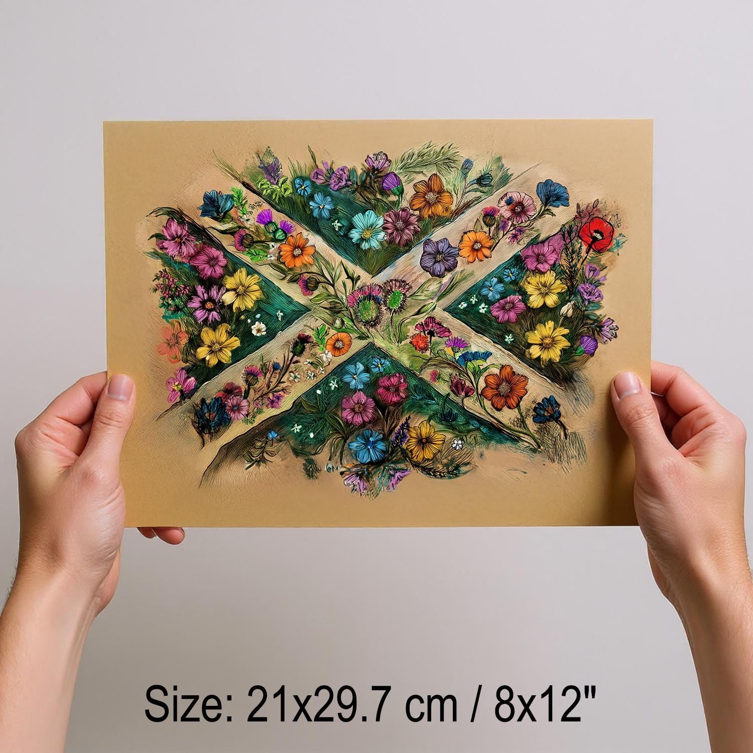 Celebrate UK heritage art with this hand drawn matte paper poster featuring the iconic Scottish flag with an artistic twist, perfect for British home decor; Raise The Colours!
