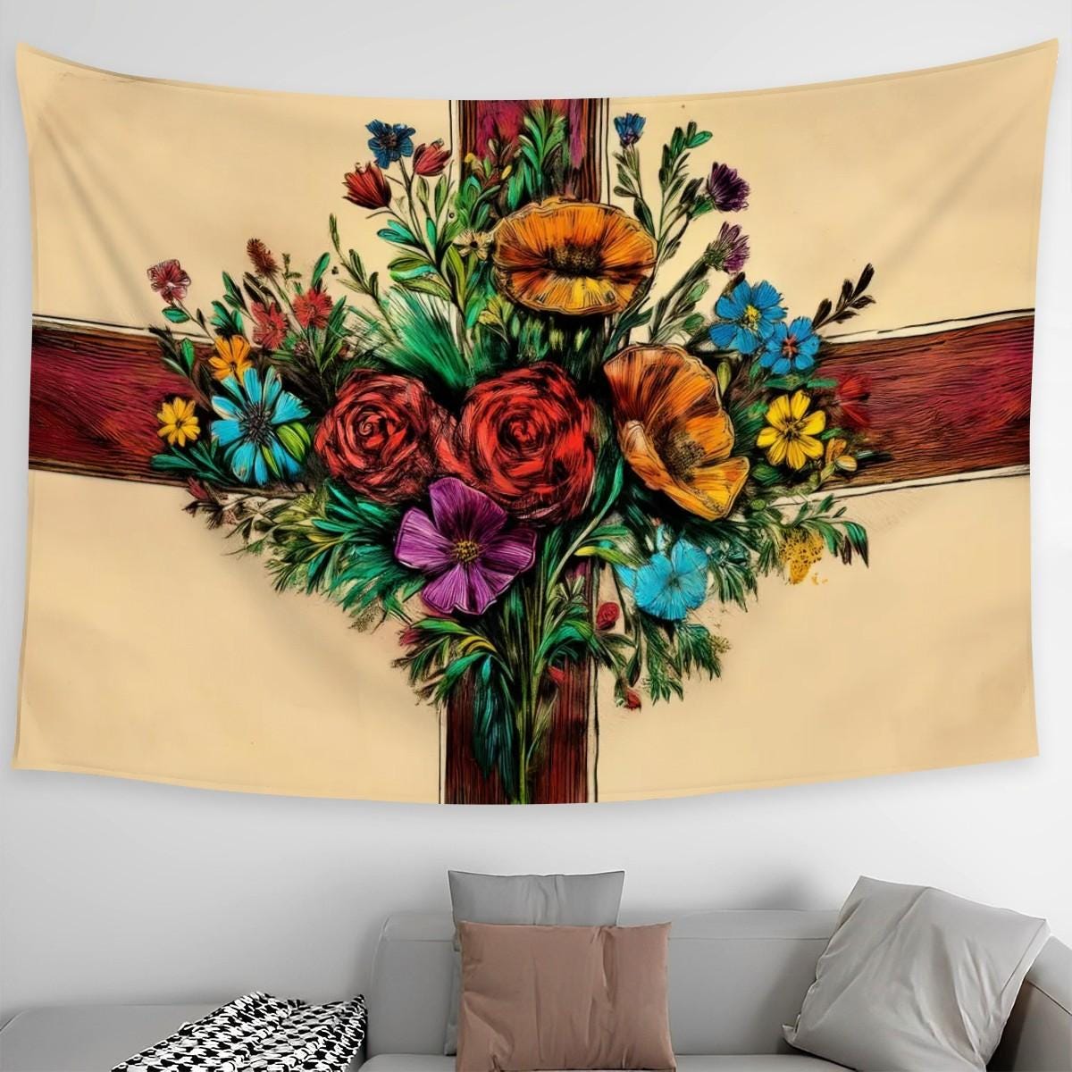 Hand wash or gentle machine wash recommended. Iron at low temperature and avoid bleach to maintain the tapestry’s vibrant colors.